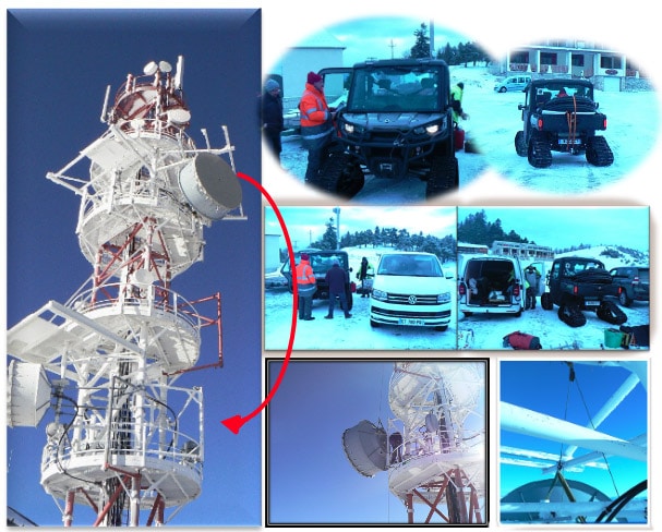 Opération de déplacement d’antenne de Ø2,40m (8ft) pendant période hivernale, site sous la neige, avec grand dévers.